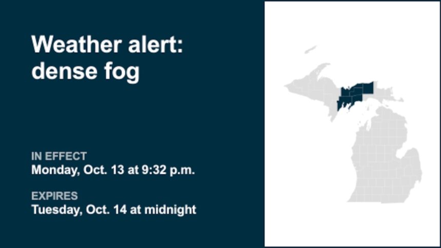 MLive Be prepared for dense fog in Michigan until early Tuesday October 14, 2025 12:40 am Advance Local Weather Alerts 0 Min Read SHARE A report was issued from the National Weather Service on Monday at 9:32 p.m. EDT for dense fog until Tuesday at midnight EDT for Alger, Luce, Delta and Schoolcraft counties. This post was originally published on this site Previous Article Apple TV+ just changed its name for ‘a vibrant new identity’ through … subtraction Next Article E-scrap collection day helps environment