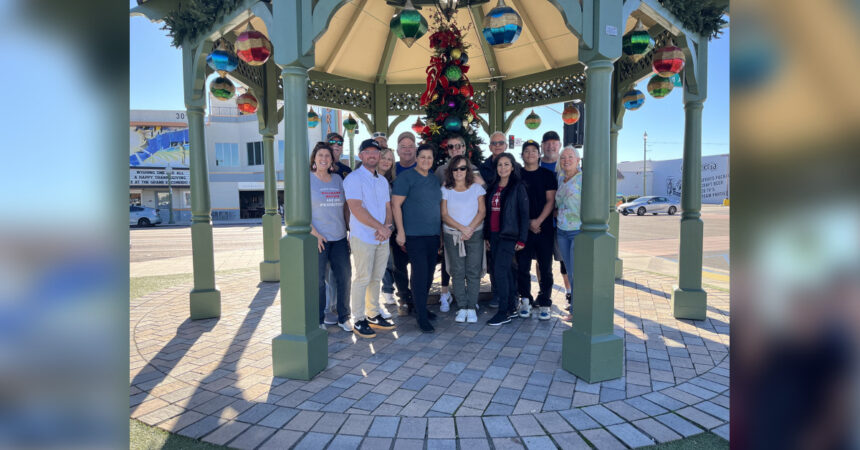 Organizers from the Sunrise Rotary Club of Escondido, Escondido Downtown Business Association, and John Paul the Great University posing with the Christmas tree in Heritage Plaza. Organizers from the Sunrise Rotary Club of Escondido, Escondido Downtown Business Association, and John Paul the Great University posing with the Christmas tree in Heritage Plaza—From left: Donna Aeling,