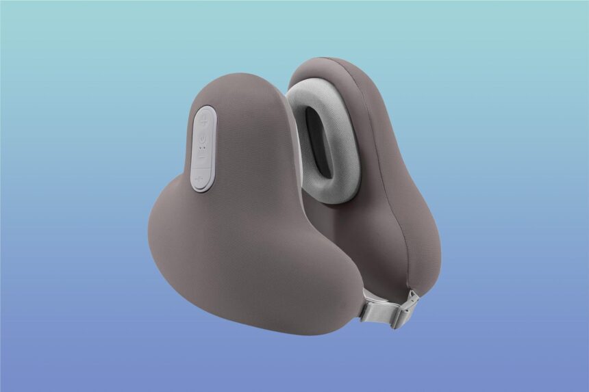 managing to get hours of sleep with this travel neck pillow. The comfortable and supportive travel pillow has noise-blocking Bluetooth headphones built right into the memory foam. Grab the in-flight travel accessory at Amazon for your next trip.